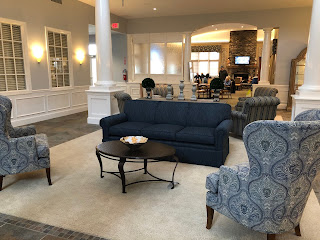 We expanded the carpeted area to the rear of the room and shortened the carpeted area in the front of the Lobby. This created a more open feel and direct access from one hallway to the other.